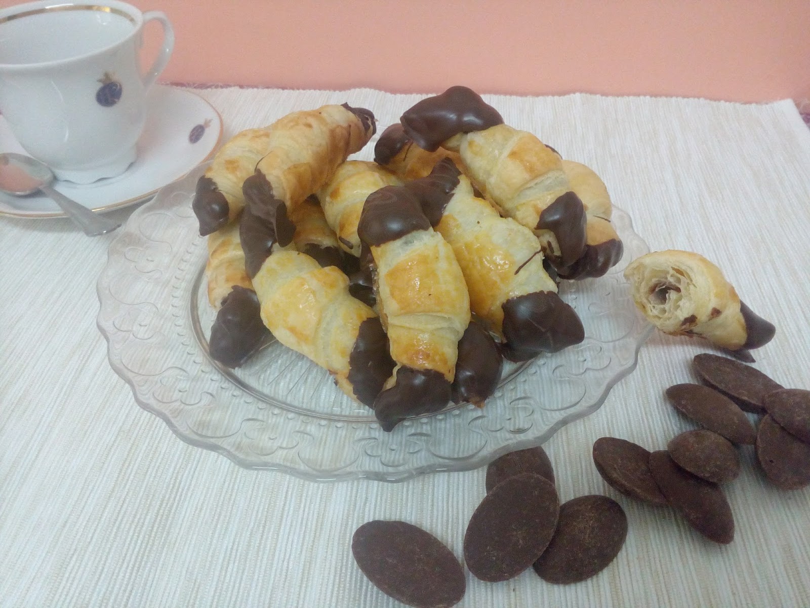 Si hemos comprado el hojaldre ya estirado perfecto, sino lo estiramos hasta que tenga un espesor de unos 3mm. Cortamos triángulos de unos 12cm de alto por 6cm de base. Ponemos una pequeña porción de la crema, como una avellana, en la parte ancha del triángulo y lo enrollamos desde esta parte hasta la punta, presionando lo justo y dejando la punta por debajo del croisan. Los disponemos en una bandeja de horno un poco espaciadas entre si, ya que crecen un poco. Pintamos con huevo batido y horneamos a 180ºC unos 20 minutos. Dejamos enfriar sobre rejilla.